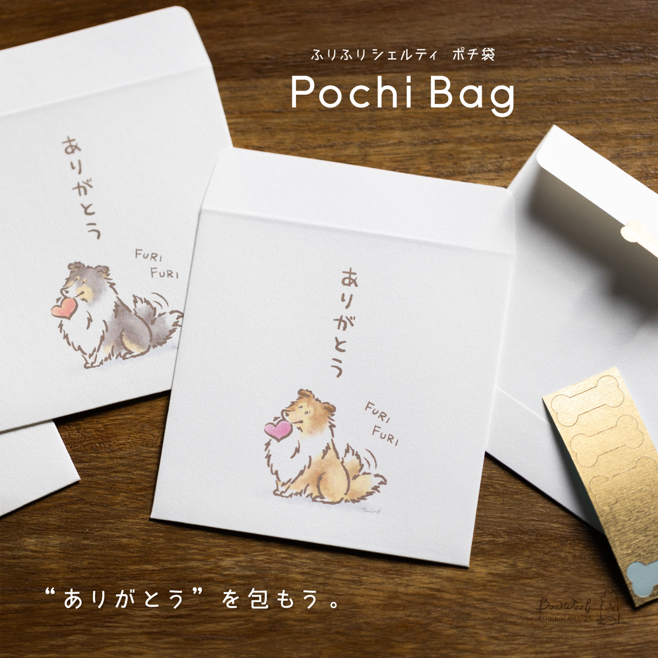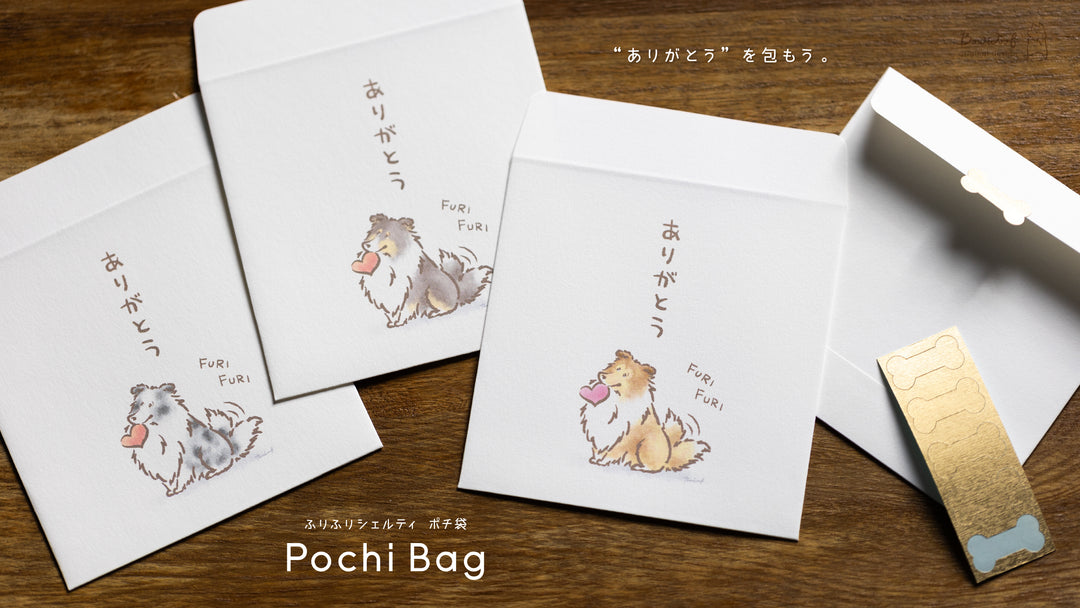 ハートをくわえてしっぽふりふりしてるシェルティの、ありがとうポチ袋、新発売!