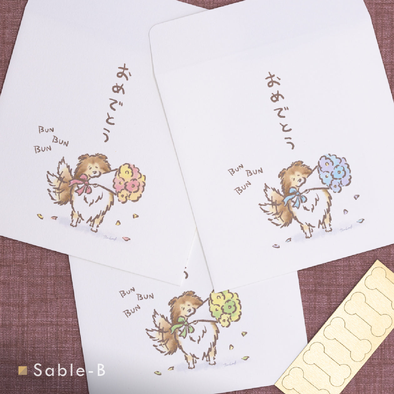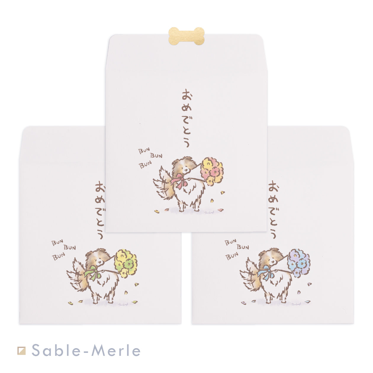 嬉しいあまり ブンブンしっぽを振って、お耳がペッタンコになっちゃったシェルティの、“おめでとう” なポチ袋。