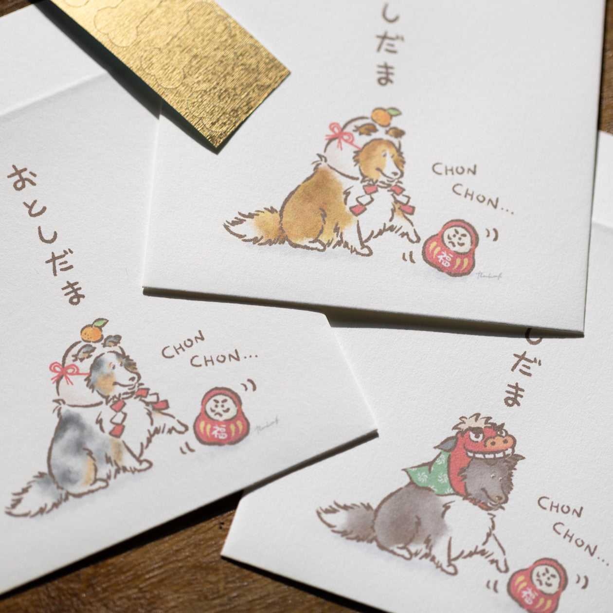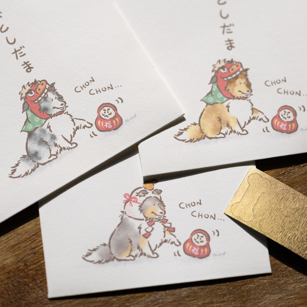 鏡餅を被らされたシェルティと、獅子舞を被らされたシェルティの2種類の絵柄で、計5枚入っています。(鏡餅2枚・獅子舞3枚)